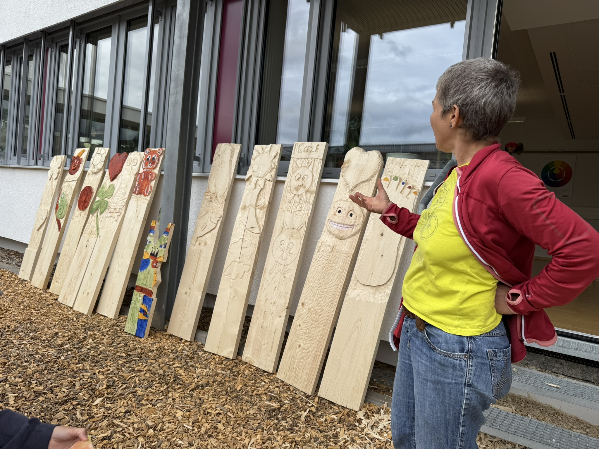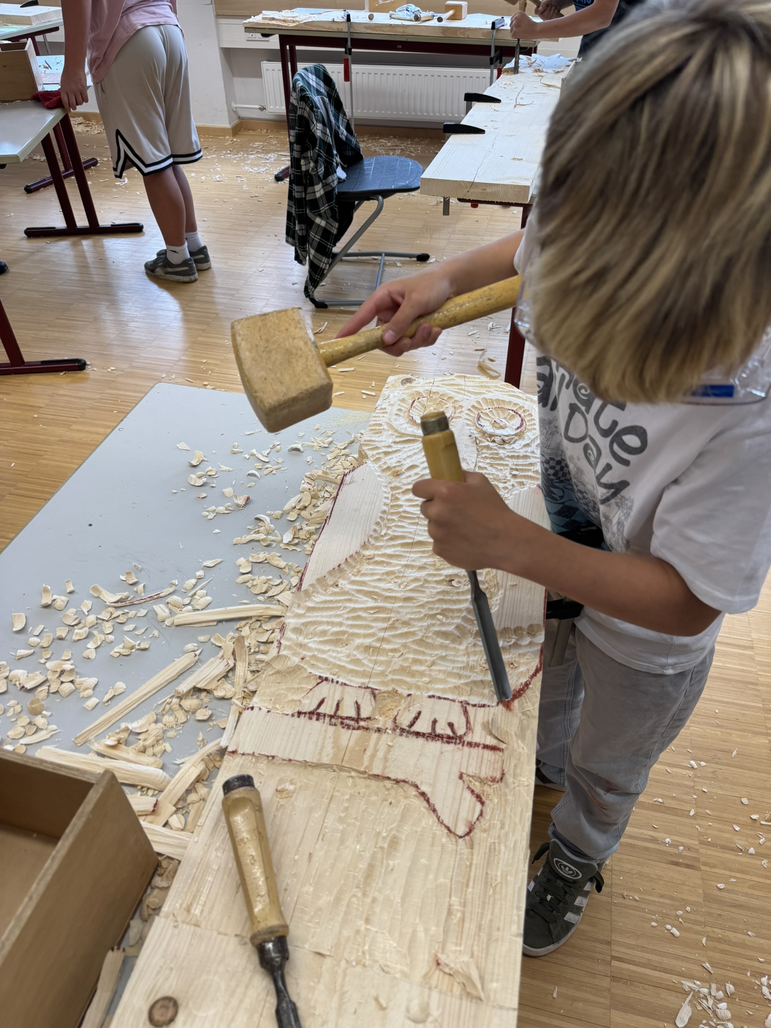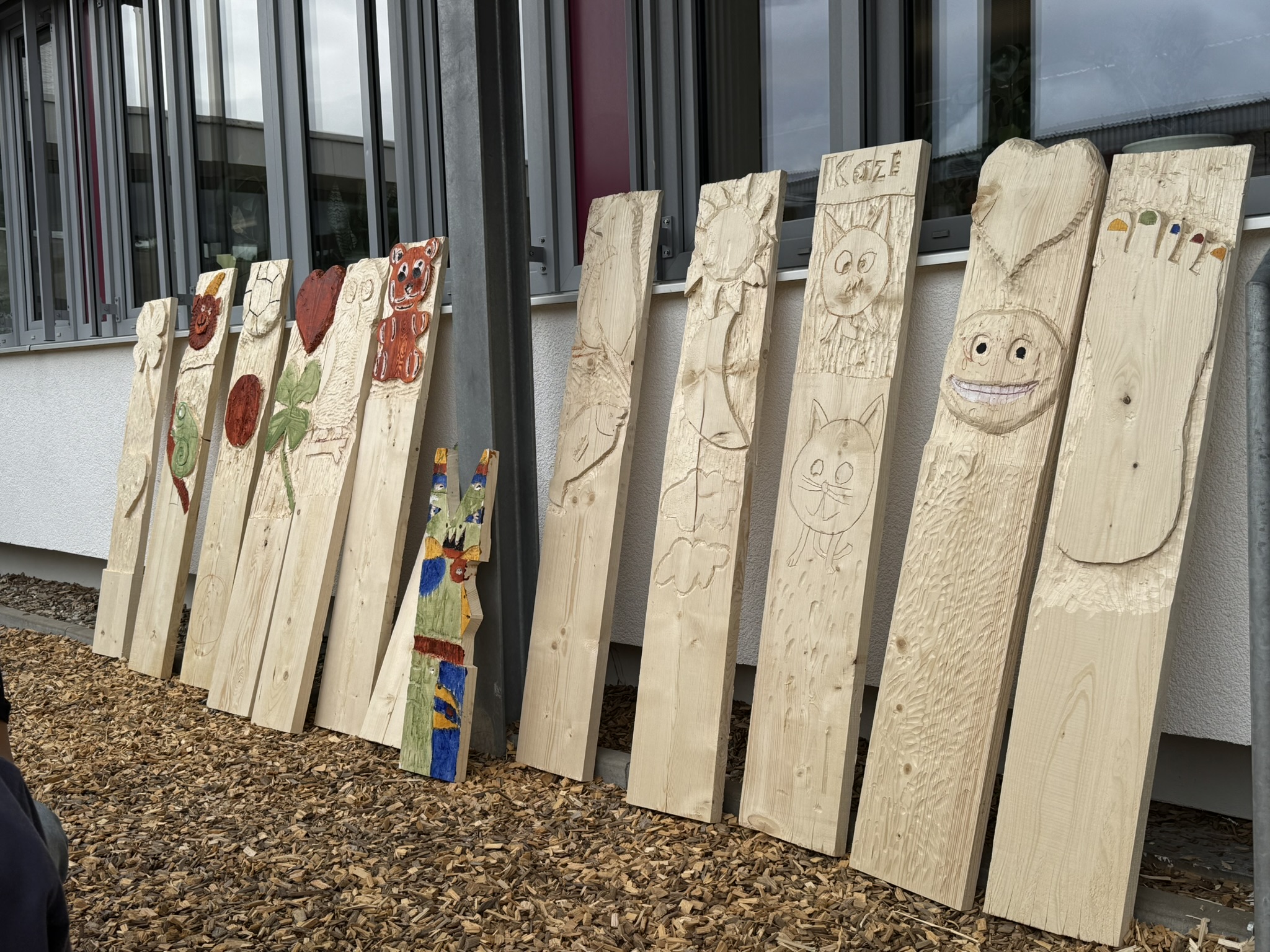 Mit Klopfholz, Stemmeisen und jeder Menge Ideen entstanden aus einfachen Holzbrettern individuelle Kunstwerke: fantasievolle Tiere, Gesichter, Muster und Formen – zum Teil farbig gestaltet oder zu kleinen Holzbauten weiterverarbeitet. Die Arbeit mit dem natürlichen Werkstoff hat nicht nur Spaß gemacht, sondern auch Begeisterung für echtes Handwerk geweckt.